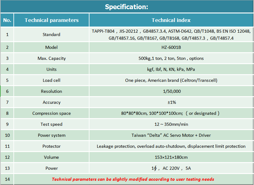 The Carton Compression Test Machine used to test compressive strength of cartons, containers and other packaging structure, adopts dynamic holding pressure technology, simulates stacking the test of pile, in order to know the compressive strength and impact-resistant capacity of product packaging during transportation and stacking.